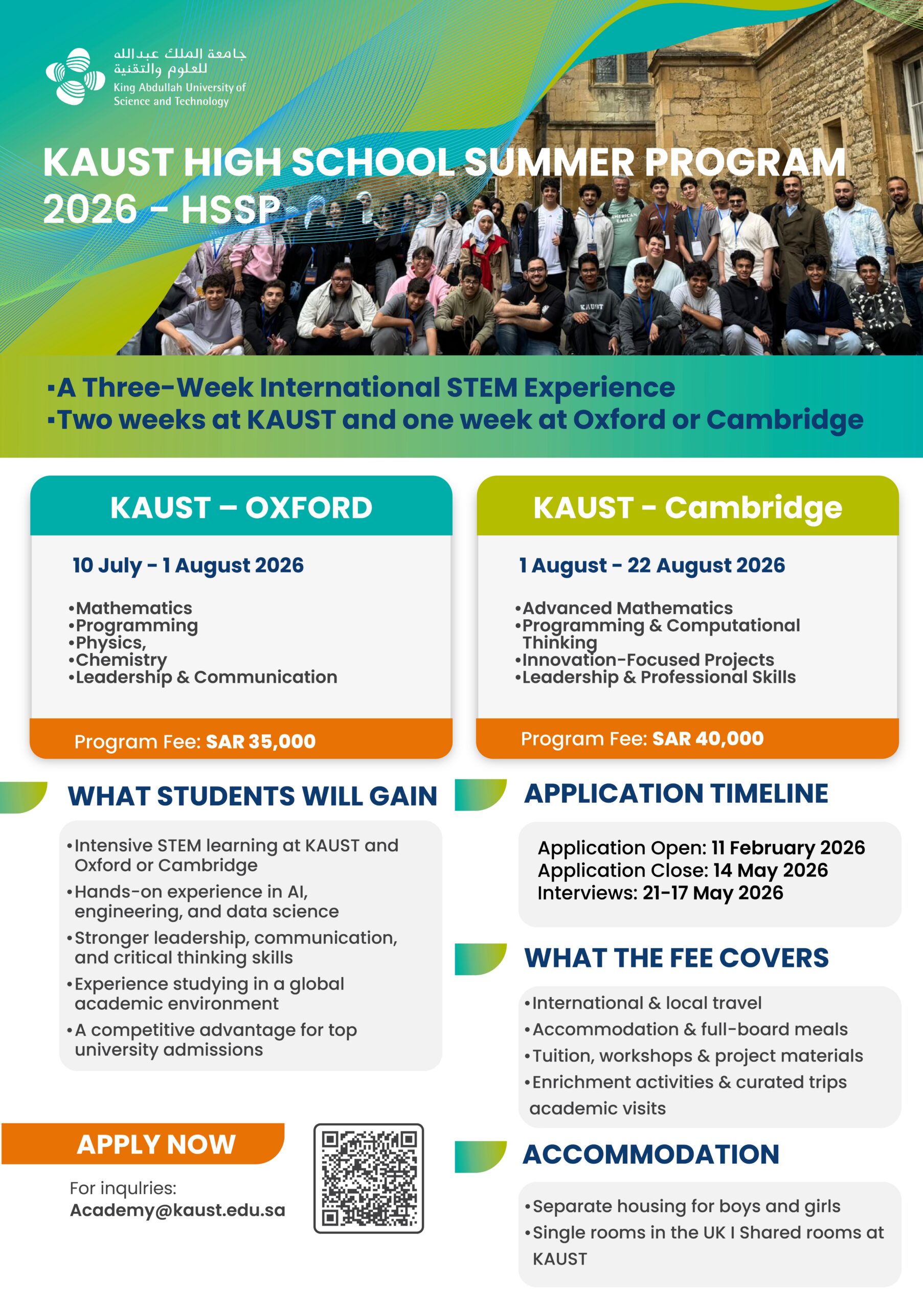 The KAUST High School Summer Program (HSSP) 2026 is a highly selective international program designed for high-achieving high school students with strong academic potential in STEM. The program blends intensive on-campus learning at KAUST with a global academic experience at Oxford University or the University of Cambridge.